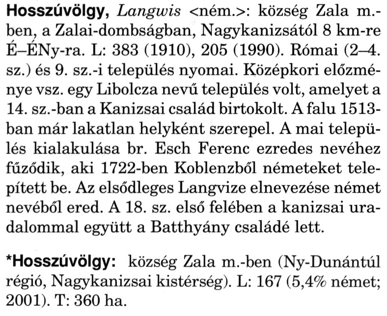 Nyilvános 2165 | 5940 | A szócikkek felismertetett szövege: | (A csillag után a kiegészítő kötetből származó szöveg következik) Hosszúvölgy, Langwis <ném.>: község Zala m.-ben, a Zalai-dombságban, Nagykanizsától 8 km-re É-ÉNy-ra. L: 383 (1910), 205 (1990). Római (2-4. sz.) és 9. sz.-i település nyomai. Középkori előzménye vsz. egy Libolcza nevű település volt, amelyet a 14. sz.-ban a Kanizsai család birtokolt. A falu 1513-ban már lakatlan helyként szerepel. A mai település kialakulása br. Esch Ferenc ezredes nevéhez fűződik, aki 1722-ben Koblenzből németeket telepített be. Az elsődleges Langvize elnevezése német nevéből ered. A 18. sz. első felében a kanizsai uradalommal együtt a Batthyány családé lett. *Hosszúvölgy: község Zala m.-ben (Ny-Dunántúl régió, Nagykanizsai kistérség). L: 167 (5,4% német; 2001). T: 360 ha. A szócikkek a következő lexikonból származnak: Cím: Magyar nagylexikon Közreműködő: Élesztős László (1949) (szerk.) ; Barabás Éva (1943) (szerk.) ; Berényi Gábor (1946) (szerk.) ; Bárány Lászlóné (szerk.) ; Adelmann-né Kertész Judit (1945) (közrem.) ; Froemel Károlyné Jáky Éva (1936) (közrem.) ; Akadémiai Kiadó és Nyomda Vállala Szerz. közl.: [... Élesztős László főszerk.] ; [szerk. Barabás Éva et al.] ; [bibliogr. Adelmanné Kertész Judit] ; [kész. az Akadémiai Kiadó Magyar Nagylexikon Szerkesztőségében] Kiadás: Budapest : Akad. K., 1993- Kötetei: 1. köt., A - Anc 2. köt., And - Bag 3. köt., Bah - Bij 4. köt., Bik - Bz 5. köt., C - Csem 6. köt., Csen - Ec 7. köt., Ed - Fe 8. köt., Ff - Gyep 9. köt., Gyer - Iq 10. köt., Ir - Kip 11. köt., Kir - Lem 12. köt., Len - Mep 13. köt., Mer - Nyk 14. köt., Nyl - Pom 15. köt., Pon - Sek 16. köt., Sel - Szö 17. köt., Szp - Ung 18. köt., Unh - Z 19. köt., Kiegészítő kötet, A - Z ETO jelzet: 030=945.11 Szakjelzet: 030 Cutter: M 14 ISBN: 963-05-6611-7 [!ISBN 963-05-6615-X] Nyelv: magyar Megjegyzés: Az 5. kötettől kiad. a Magyar Nagylexikon Kiadó ; A 6. kötettől főszerk. Berényi Gábor ; A 6. kötettől szakszerk. Bárány Lászlóné et al. ; A 6. kötettől bibliogr. Froemel Károlyné ; Bibliogr. a szócikkek végén |