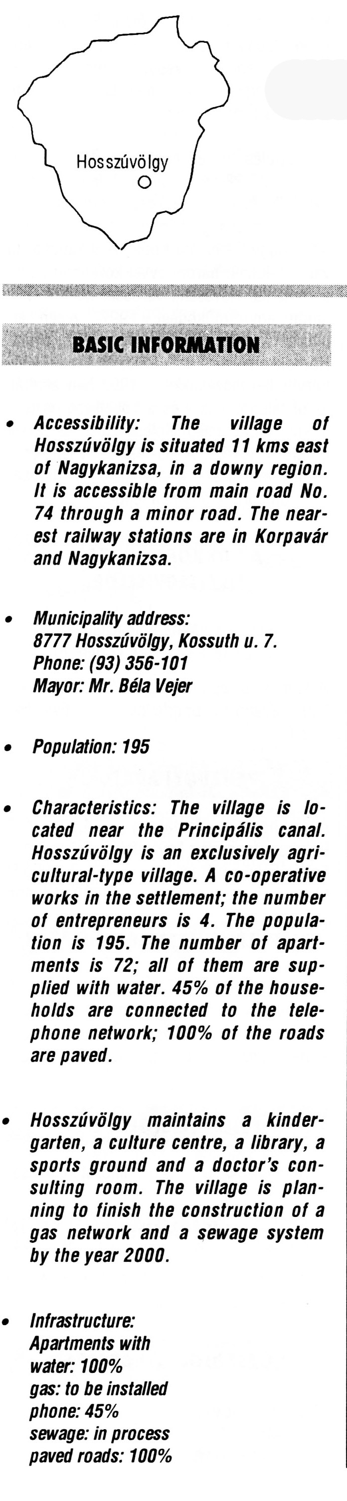 Nyilvános 2185 | 6278 | Hosszúvölgy | BASIC INFORMATION Accessibility: The village of Hosszúvölgy is situated 11 kms east of Nagykanizsa, in a downy region. It is accessible from main road No. 74 through a minor road. The nearest railway stations are in Korpavár and Nagykanizsa. Municipality address: 8777 Hosszúvölgy, Kossuth u. 7. Phone: (93) 356-101 Mayor: Mr. Béla Vejer Population: 195 Characteristics: The village is located near the Principális canal. Hosszúvölgy is an exclusively agricultural-type village. A co-operative works in the settlement; the number of entrepreneurs is 4. The population is 195. The number of apartments is 72; all of them are supplied with water. 45% of the households are connected to the telephone network; 100% of the roads are paved. • Hosszúvölgy maintains a kindergarten, a culture centre, a library, a sports ground and a doctor\'s consulting room. The village is planning to finish the construction of a gas network and a sewage system by the year 2000. • Infrastructure: Apartments with water: 100% gas: to be installed phone: 45% sewage: in process paved roads: 100% This text came from the following book: Title: Handbook of Zala county (Zala megye kézikönyve) Series: County handbooks of Hungary (Magyarország megyei kézikönyvei) Chief editor: Hóbor József Publisher: (Hatvan), CEBA-Hungary Ltd, 1998 ETO: 908.439.121(035) ; 050.8(439.121) ISBN: 963-9089-18-2 Pages: 488-1040 p. Remark: Closed on: 1998. márc. 31. |